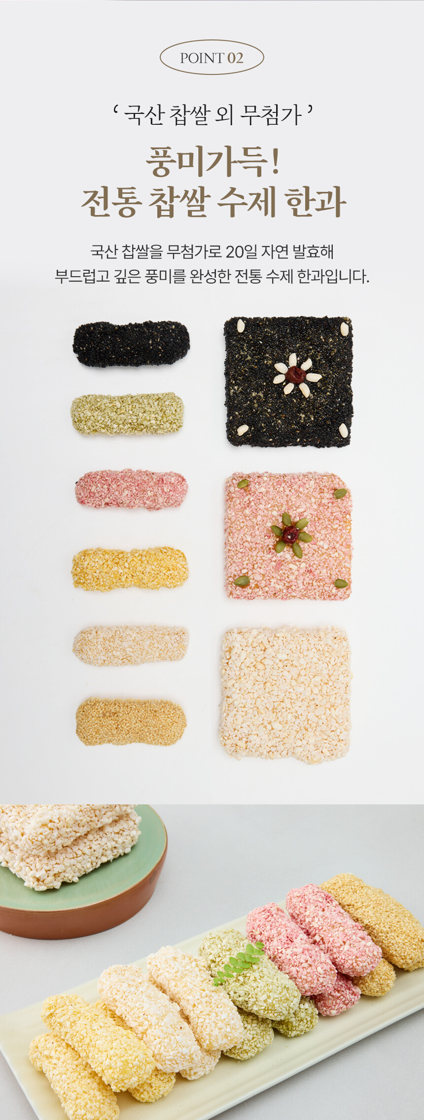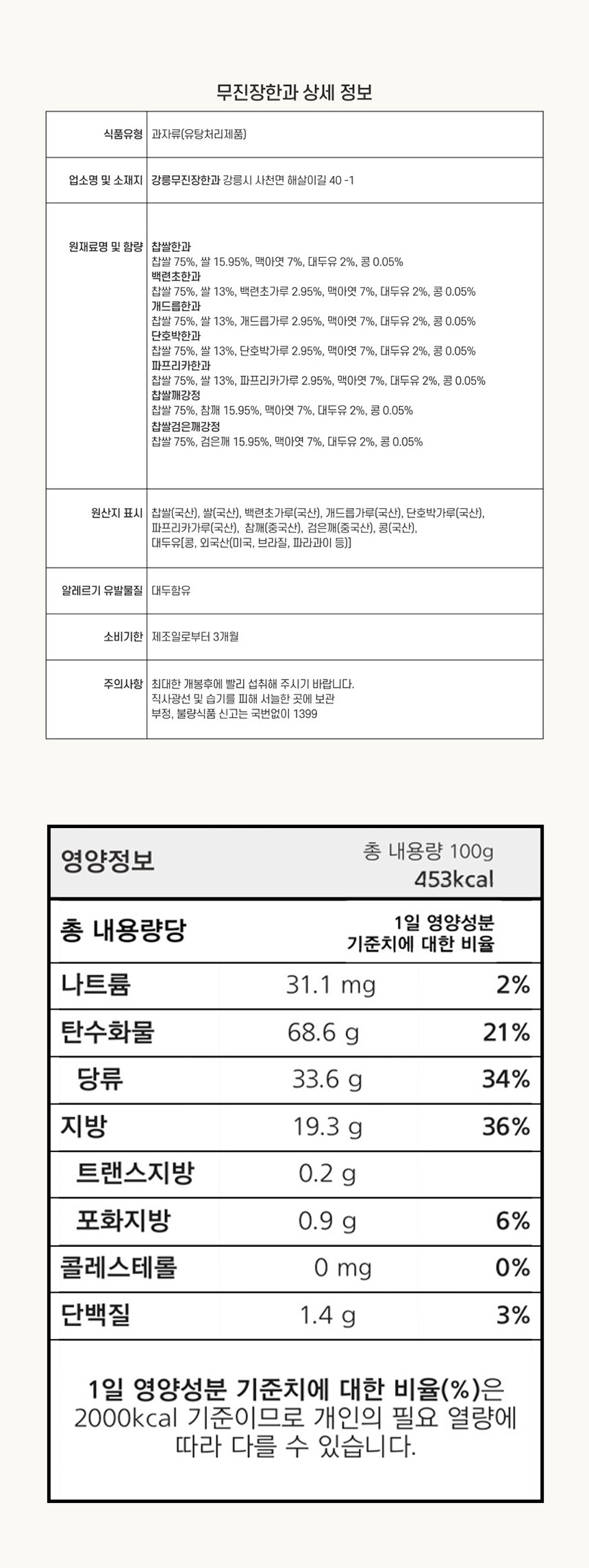 찹쌀(국산), 맵쌀(국산),백련초가루(국산), 개드릅가루(국산), 단호박가루(국산), 파프리카가루(국산), 깨(중국산, 참깨, 들깨, 검은깨), 대두유[콩, 외국산(미국,브라질, 파라과이 등) |